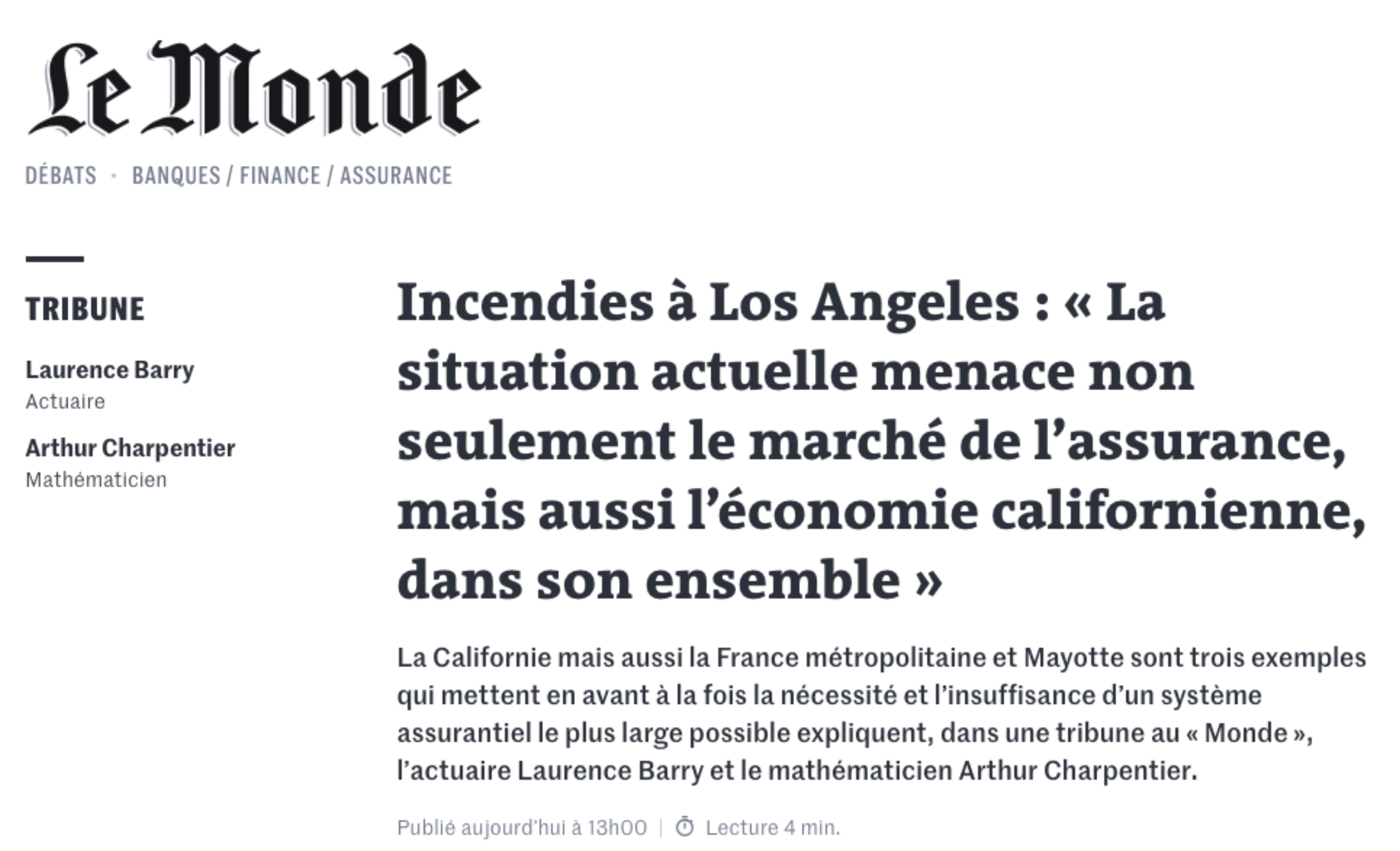 Incendies à Los Angeles : « La situation actuelle menace non seulement le marché de l’assurance, mais aussi l’économie californienne, dans son ensemble », Le Monde